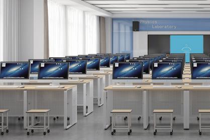 Furniture designed for IT labs with cable management, device storage, and ergonomic screen positioning.