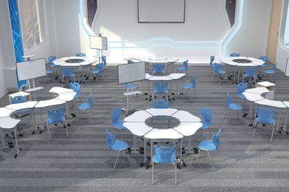 Modern, flexible learning environments with mobile, adaptable furniture for group and digital learning.